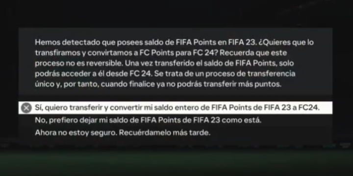 ‘Hemos notado que tienes un saldo pendiente de puntos FIFA en FIFA 23. ¿Te gustaría transferirlo y convertirlo en puntos FC en EAFC24? Ten en cuenta que esta transferencia no se puede deshacer.