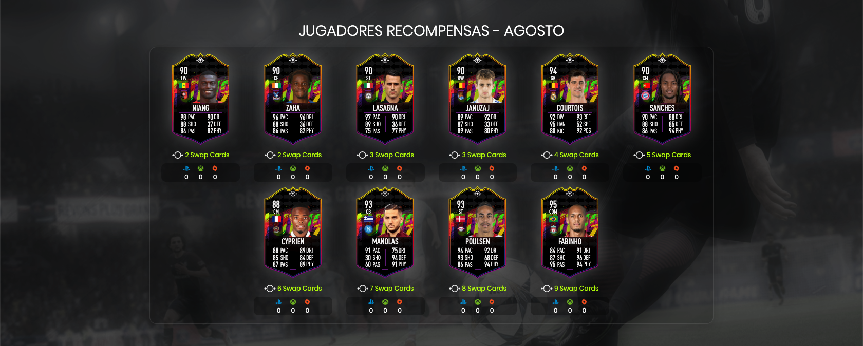 Durante cada período de Ofertas de Intercambio, los elementos del Jugador de Ofertas de Intercambio pueden intercambiarse por artículos de Recompensa a través de los SBCs. Todos los SBC de Swap Deals están disponibles durante todo el mes.