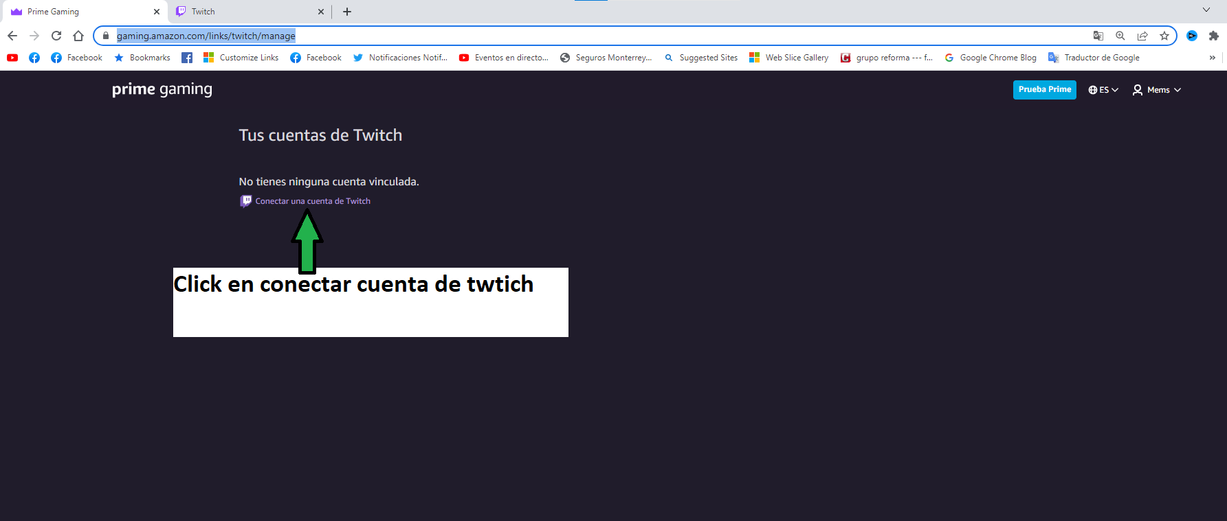 Conecte su cuenta de Twitch a una cuenta de Amazon Prime, en su sitio web https://gaming.amazon.com/links/twitch/manage