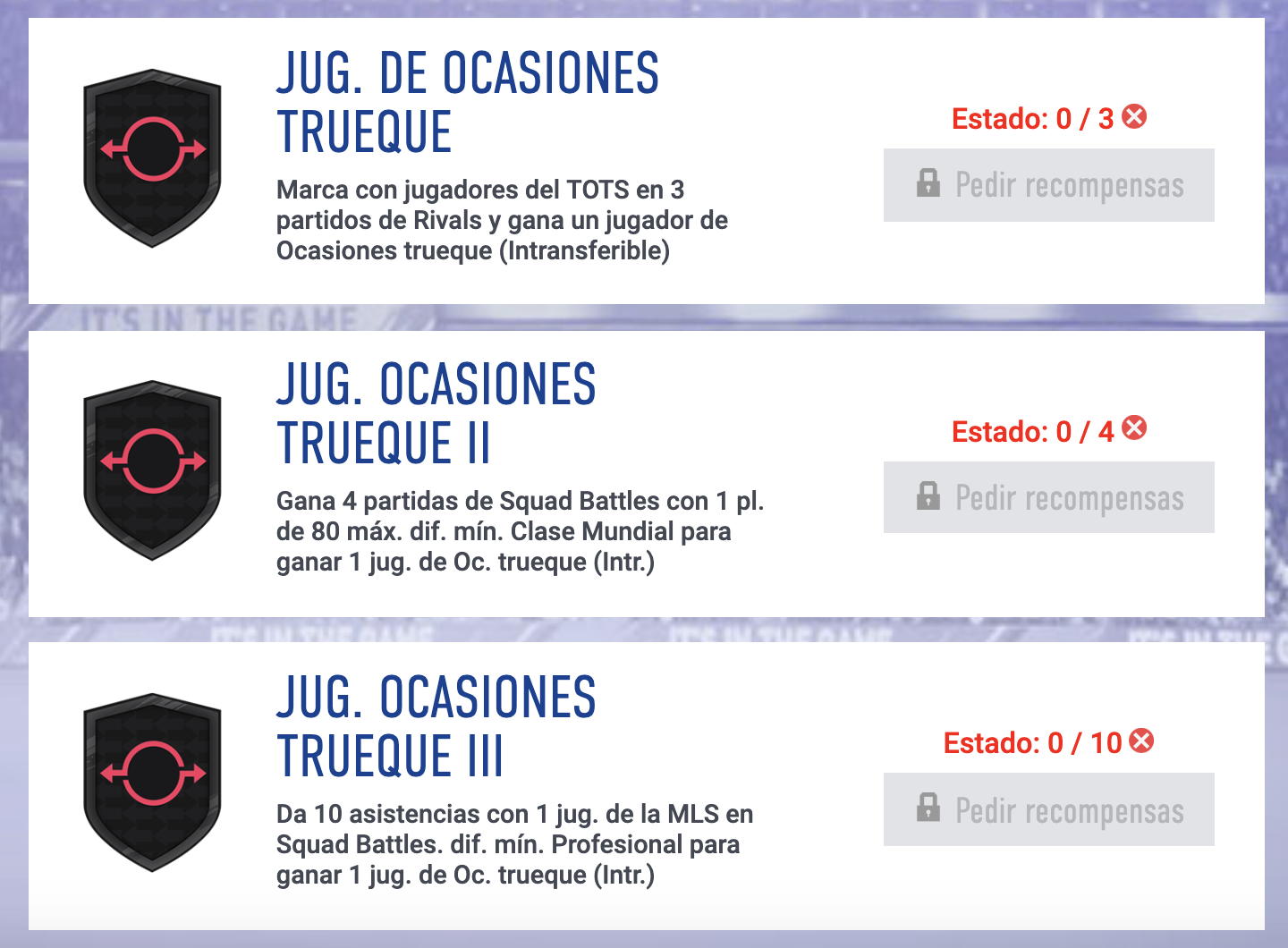 Dentro de los objetivos hay que hacer ciertos desafíos para lograr obtener cartas especiales, sobres, kits, jugadores Trueque, entre otras recompensas.