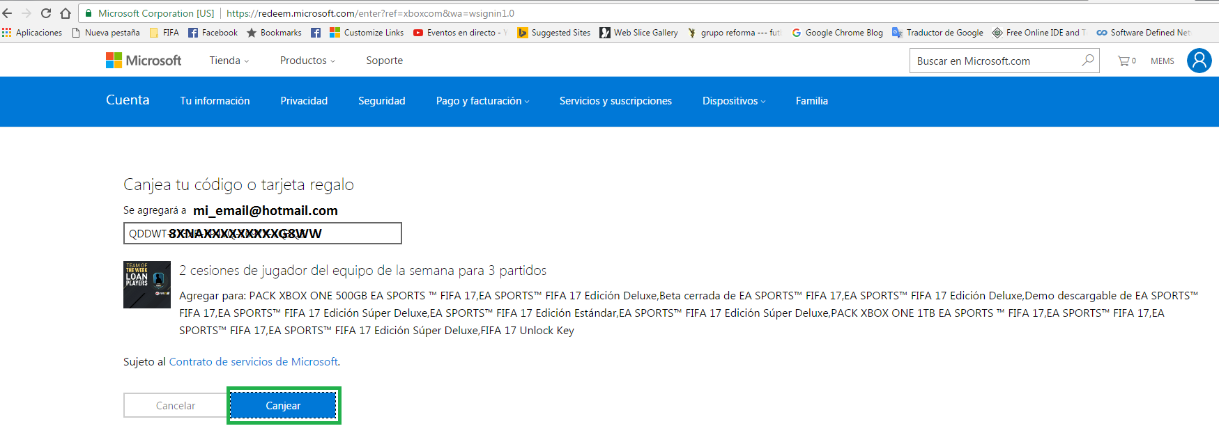 4. Verifica que la pagina Canjear Código es mostrada e ingresa los 25 caracteres de tu código.