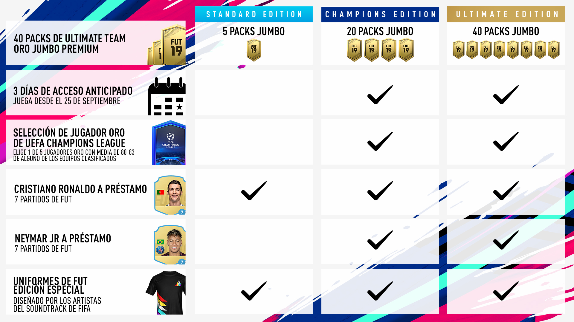FIFA 19 hay 3 versiones disponibles (STANDARD, CHAMPIONS y ULTIMATE).